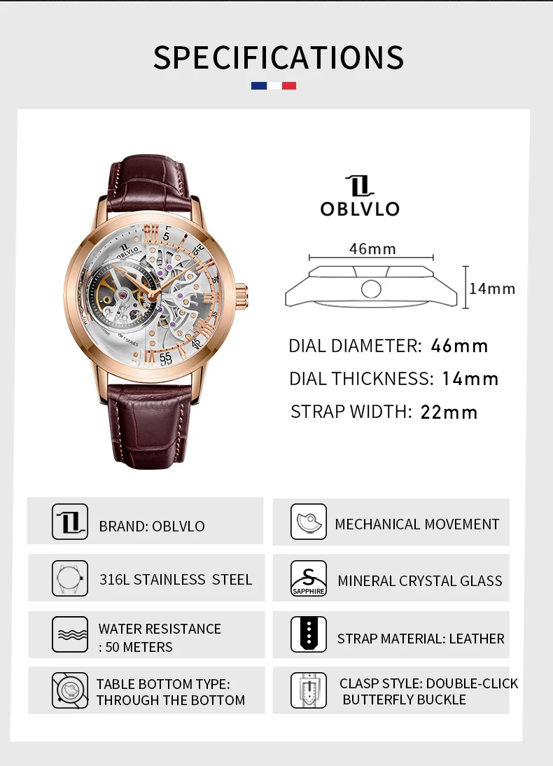 This mechanical wristwatch features an automatic self-winding movement and an analog numberless dial. The round stainless steel case is complemented by a crystal glass window and a comfortable genuine leather band with a push-button hidden clasp. Measuring 40–44 mm in diameter and 14 mm in thickness, it offers a sleek, minimalist design suitable for both business and casual wear. The watch is shock-resistant and water-resistant up to 5 bar (50 meters), ensuring durability for everyday use.